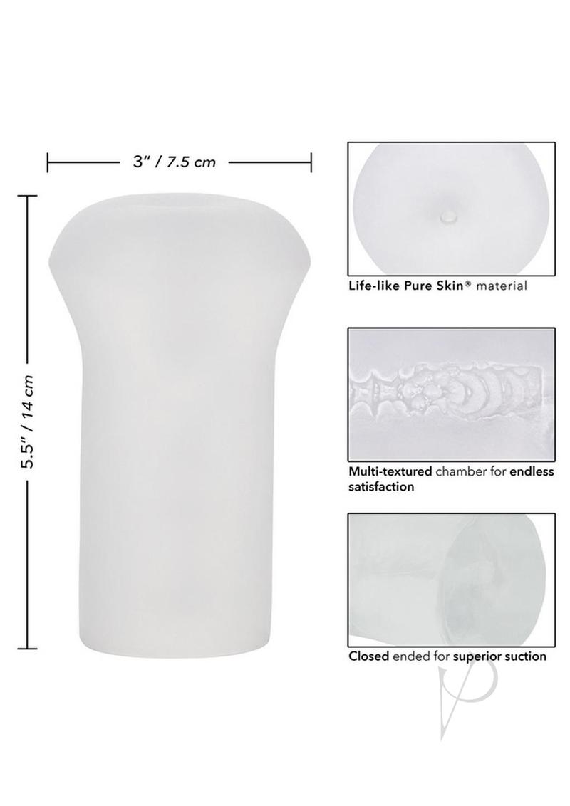 Life-like Pure Skin® material. Soft, tight and stretchy. Multi-textured chamber for endless satisfaction. Closed ended for superior suction. Hygienically superior and maintenance free.