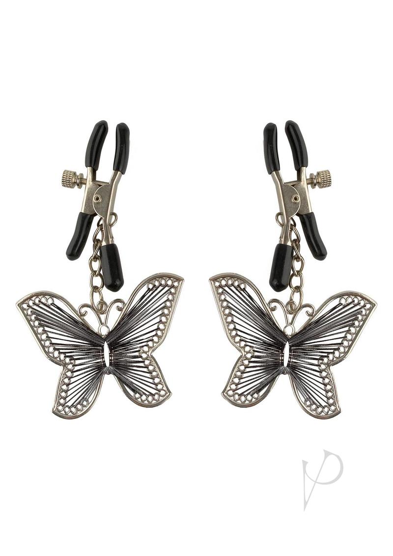The amount of pressure you apply to the nipple is adjustable by turning the screw, while the butterflies give you subtle stimulation with each movement.