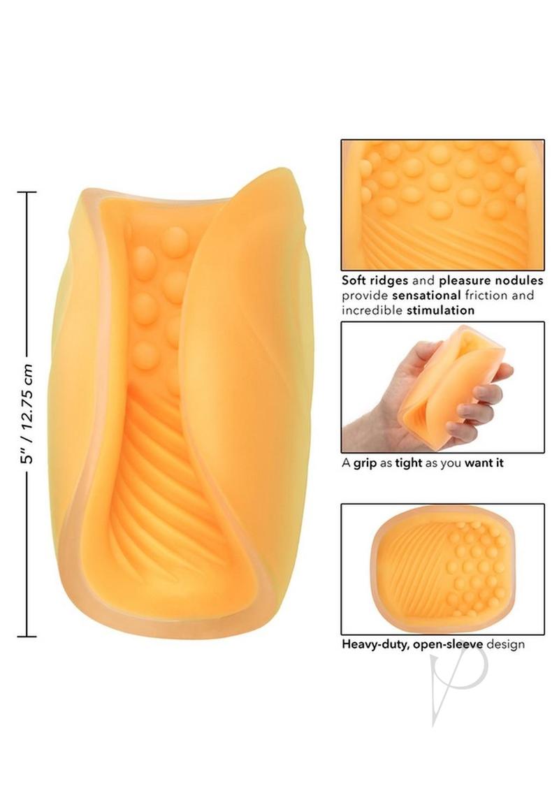 Heavy-duty, flexible, open-sleeve masturbator. Dual-density for a comfortable grip and powerful hold. Soft ridges and pleasure nodules provide sensational friction and incredible stimulation. Open-sleeve design allows for a grip as tight as you want it.