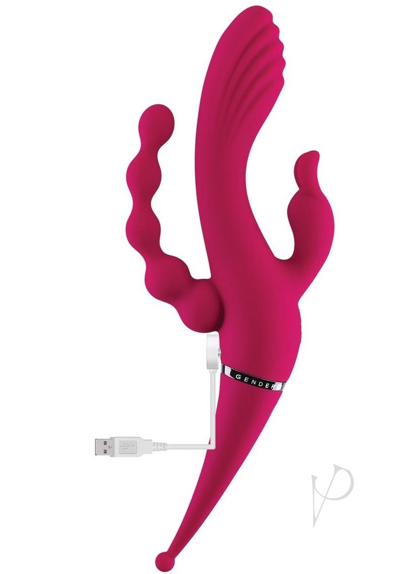 This remarkable vibrator has four points of stimulation in just under 10 inches! The center shaft features two playable ends ‚Äö a gently curved side with a bulbous textured tip, and a thin, pointy round ball end for targeted stimulation. Emerging from either side are two more stimulators ‚Äö a hard-working rabbit with buzzing ears and a chunky head, and a thin, curved beaded shaft that flexes easily to move with your body. A 2-button control panel engages 3 motors at once, with a separate button for the round-tip pointer. Find out what fantasies this quadruple-stimulation toy can bring to life with its abundant possibilities! Completely rechargeable, water submersible and easy to clean.